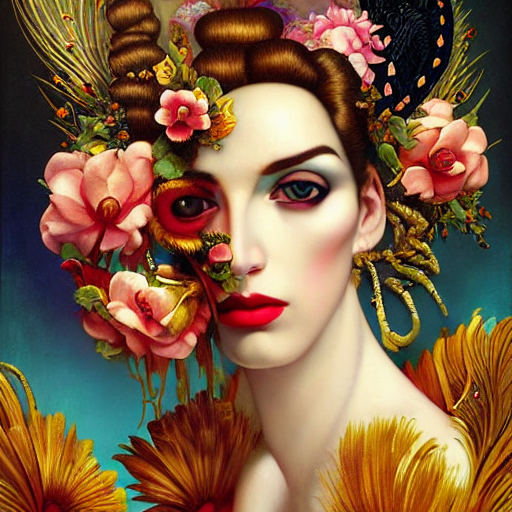 Prompthunt Dynamic Composition A Painting Of A Woman With Hair Of Flowers And Peacock Plummage Wearing Ornate Earrings A Surrealist Painting By Tom Bagshaw And Jacek Yerga And Tamara De Lempicka And